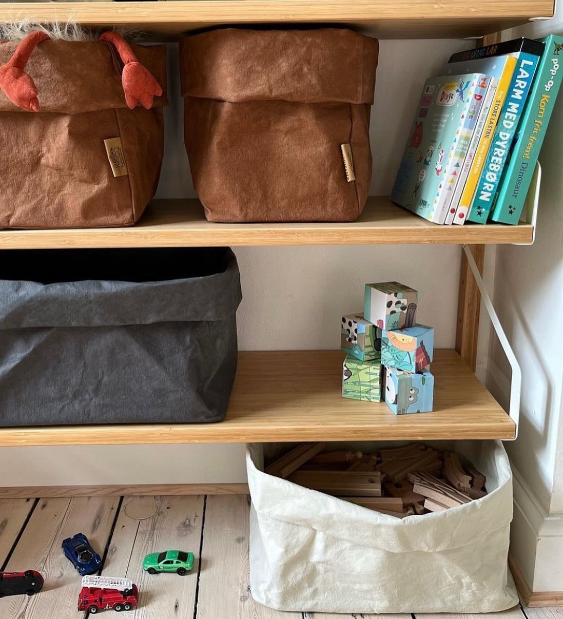 Med dens faste bund tilbyder Vassoio bakken mere form og stabilitet UASHMAMA paper bags. Bakken er den perfekte opbevaringsløsning i køkkenet, i skufferne, på værelset, i reolen, som magasinholder, på badeværelset til toiletsager eller ved puslebordet til bleer og andet baby tilbehør.
