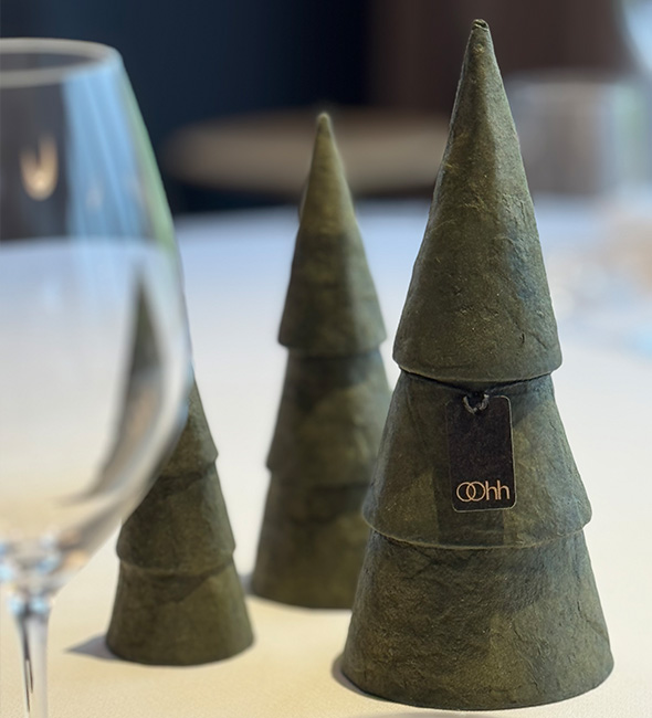 Det anvendte papir, som vi bruger kommer fra datoudløbet aviser og andet affaldspapir, hvilket sikrer, at dette produkt har en minimal indvirkning på miljøet. Om juletræerne pynter på bordet, i restauranten, på kontoret eller andet sted, så er de helt sikkert en samtalestarter og en fryd for mange sanser. Det er en perfekt gave til en du har nære, firmagaver eller til dig selv. Som med resten af produkterne fra OOhh henvender de sig til enhver for hvem miljøet har en stor betydning  ligesåvel som for de med stor interesse for flot design. Kombiner evt. med andre af OOhh's bæredygtige julepynt.