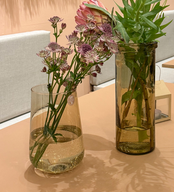 Ved at vælge et håndlavet produkt er du med til at beskytte miljøet for store energibesparelser og samtidig for du et smukt unikt produkt. Genbrugsglas har den unikke egenskab at glas kan genbruges igen og igen uden at miste dets oprindelige kvalitet. Alle produkter i OOhhx glas kollektionen er fremstillet i genbrugsglas og er enten håndlavet eller mundblæst. På grund af risiko for farveændring på farvet genbrugsglas anbefaler vi ikke maskine opvask.